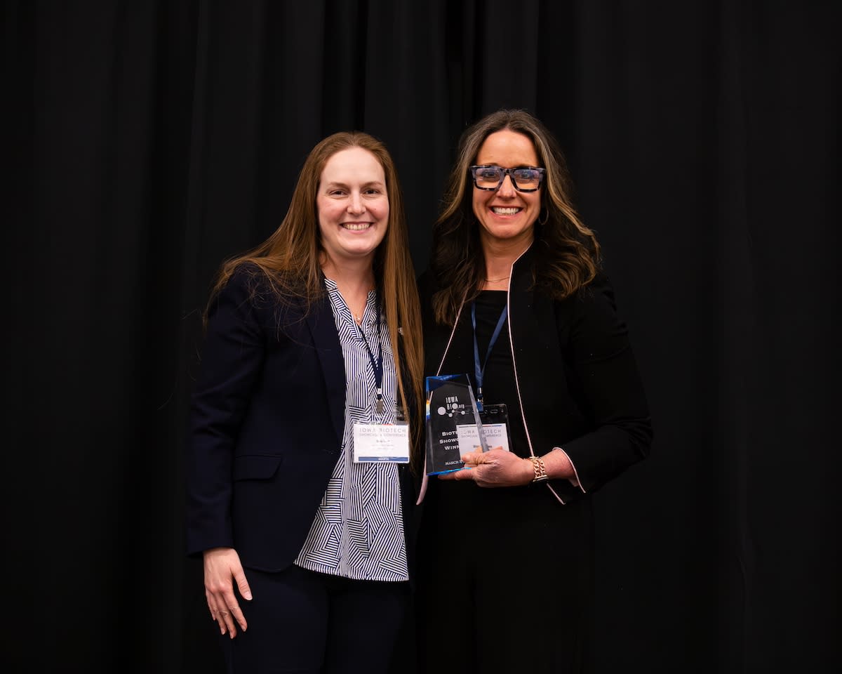 Pictured Above: IowaBio Chair Emily Fuerst awards Dr. Alisa Drapeaux, Ph.D., CEO of TRI Medical with the 2025 Iowa Biotech Showcase Award.